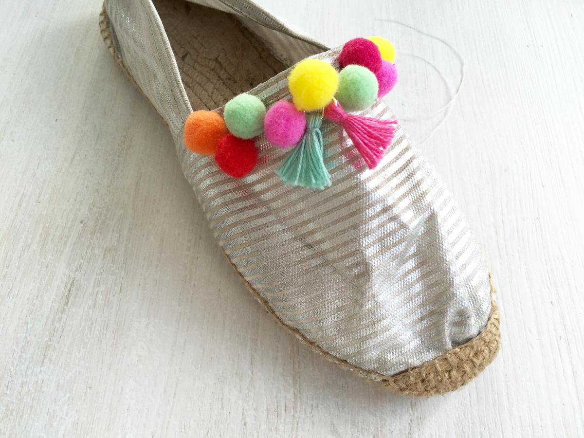 Hoy quiero enseñarte esta customización que le hice a unas alpargatas. El estilo boho está en auge asique con unos pompones de colores y algunas borlas les dí un toque diferente y colorido.