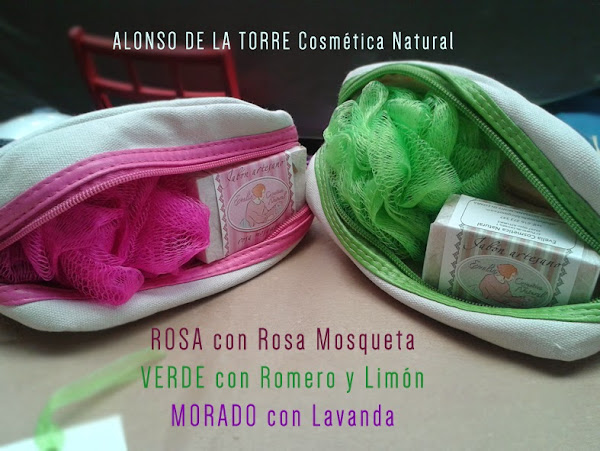 Caja de cartón decorada con dos jabones artesanos, dos mini jabones de 25 gr., un bálsamo labial de karité sabor frambuesa y una jabonera de Barruntando o de Charo Cimas.