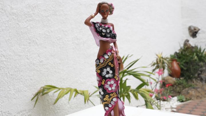 Esta africana tiene un acabado Rustico, asi que no le quise poner mucho oro, asi que Resicle uno de mis collares que tenia bolitas de madera y tomé un poco de cadena de cola de ratón color oro viejo introducí las bolitas de madera 3 blancas 3 negras y asi sucesivamente hasta que hice una cadena que pudiera darle 2 vueltas al cuello de mi africana. Al final le puse un broche de cocodrilo para cerrar el collar y ya estuvo!