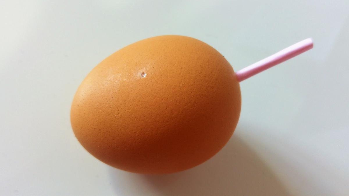 1.- Con un sacacorchos (o aguja), hacer un agujero en la parte inferior del huevo, y otro en la superior o lateral. El agujero inferior puede ser un poco más grande, ya que será por él por donde introduciremos posteriormente nuestro mensaje enrollado y, también, nos facilitará vaciar el huevo. Podéis soplar por el agujero superior para que se vacíe más rápido.
