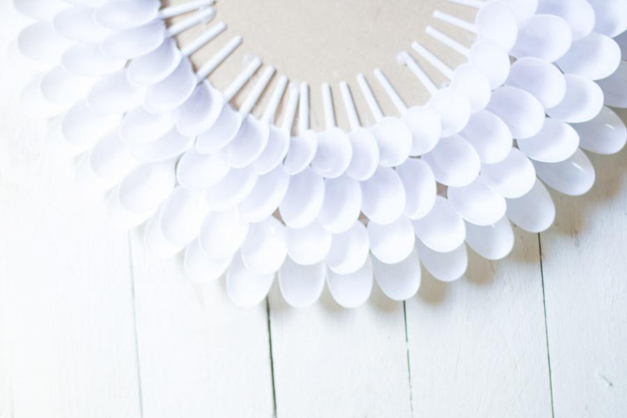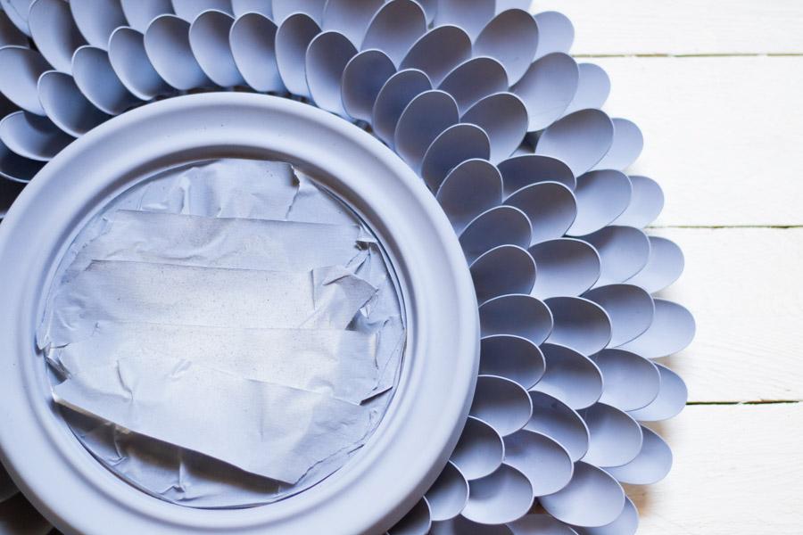 Necesitas una base de cartón o madera, cucharas de plástico, cinta de carrocero, pistola de silicona, espejo, pintura en spray y tijeras.
