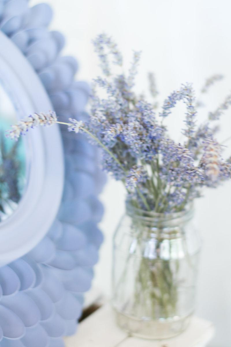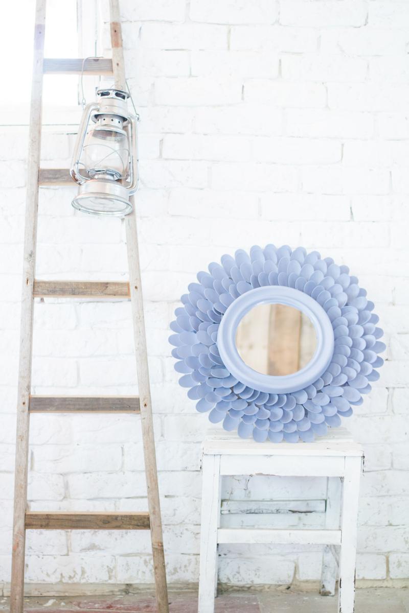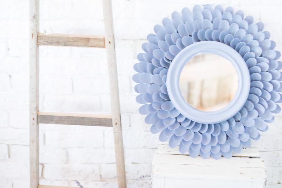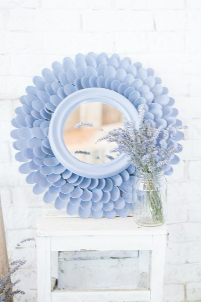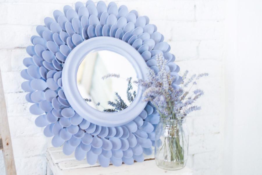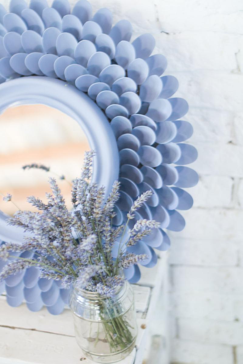 Vete cortando el mango de la cuchara y vete pegando alrededor de nuestra base. Haz cuantas vueltas necesites. Una vez acabado, pega el espejo por encima, yo en mi caso le dejé también el marco. Tapamos el espejo con cinta de carrocero y pintamos con pintura en spray. Yo usé un color morado de Chalk paint en spray, que le dio un toque mate a mi espejo de cucharas.