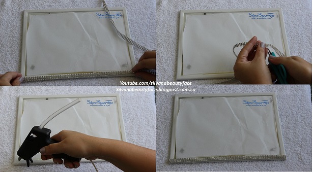 Luego se procede a pegar la cinta con brillantes, en el marco del espejo con mucho cuidado de no quemarse con la silicona.