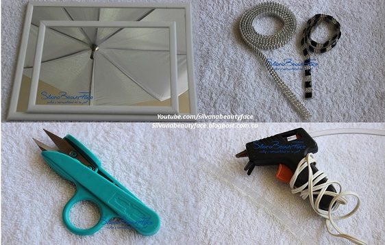 Comiencen midiendo los lados de los espejos, para luego cortar la cinta con brillantes. Si tienen spray de color plateado pueden pintar los marcos antes de colocar la cinta.