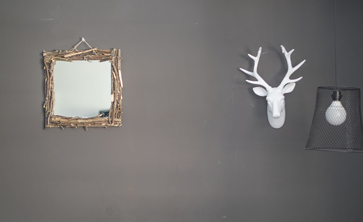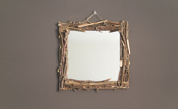 Se trata de un espejo de pared con marco hecho con ramas y cartón reciclado.