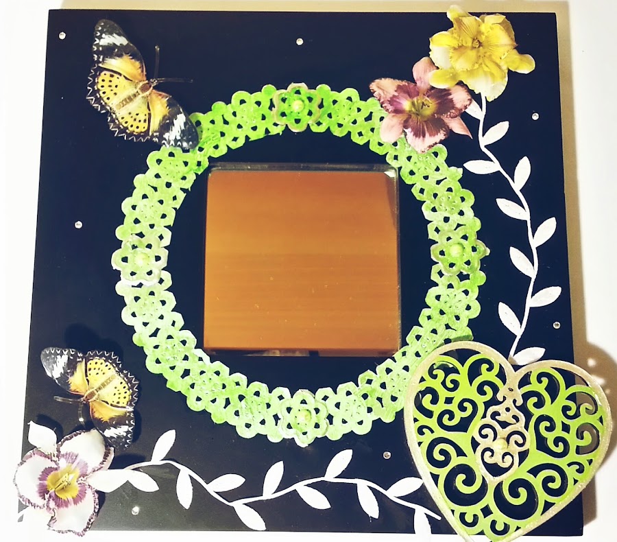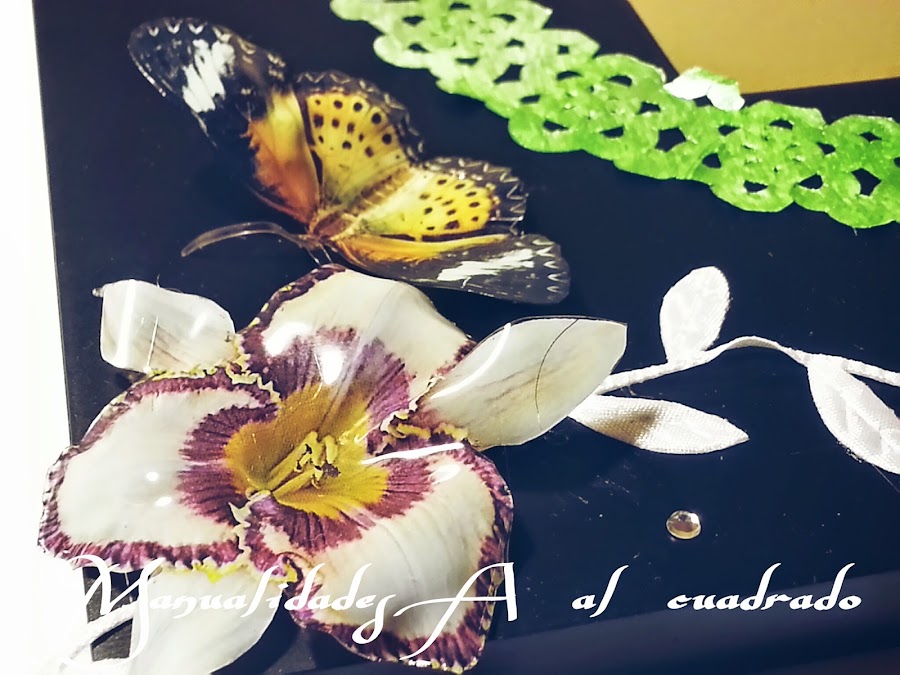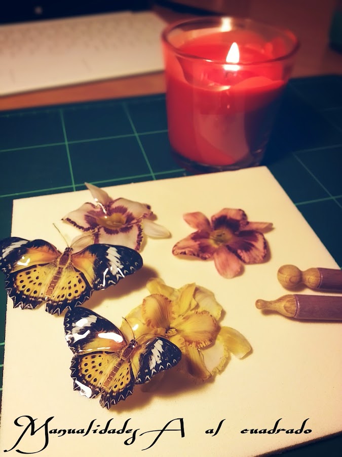 Pues bien, tenía una lámina de mariposas que quería usar justamente para decorar este espejo, además de otras flores que me habían sobrado aún.