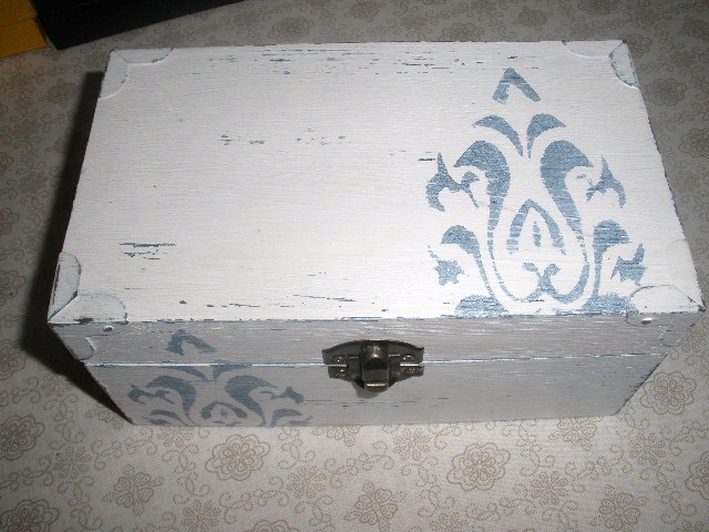 - estarcir el dibujo (yo hice la plantilla con un arabesco que busqué en Internet y recorté en acetato, también vale el papel vegetal o el de hornear) con el color gris payne pero sin dar mucha pintura ni definir muy bien los bordes.Volver a lijar un poco los motivos que acabáis de estarcir. Este paso podéis suprimirlo si no queréis ponerle ningún motivo.