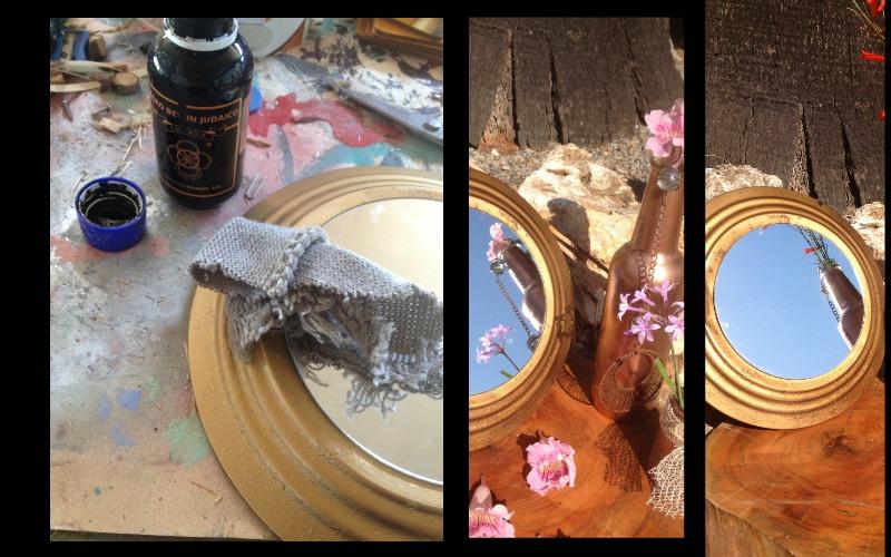 Pintarlo con spray dorado ,pegar el espejo con silicona (supongo que habrán más pegamentos,pero como los cristaleros siempre la usan?yo me fio) ...y para envejecerlo untar un trapo viejo con betún de judea y esparcirlo...