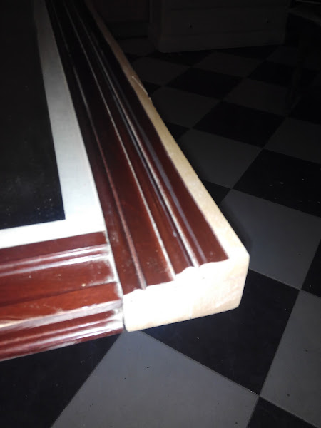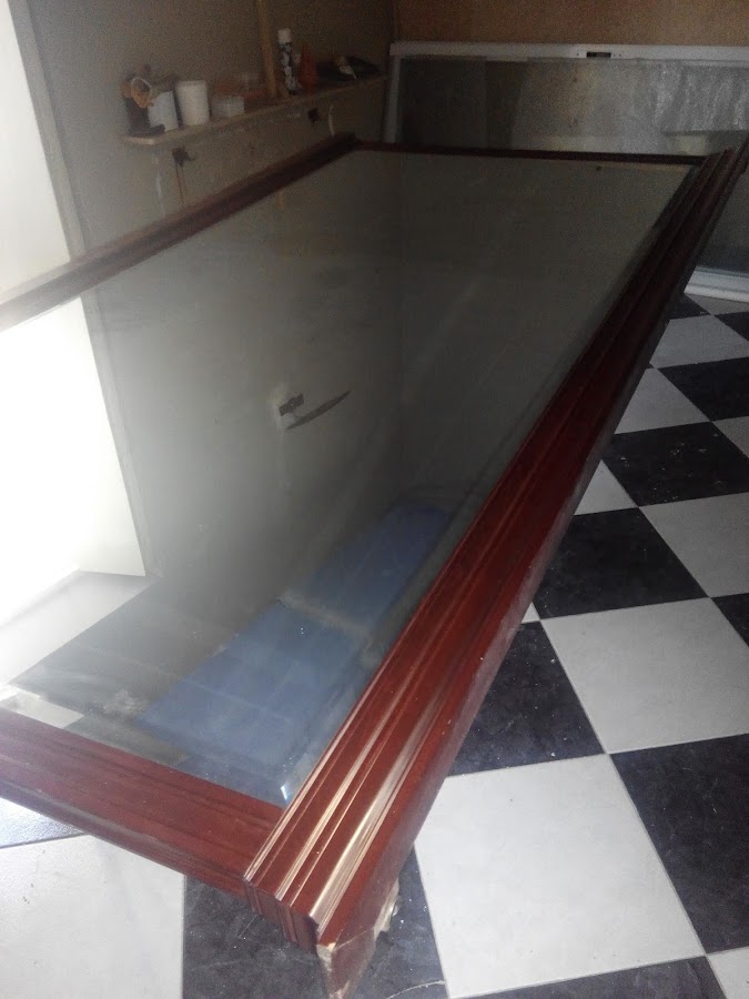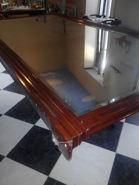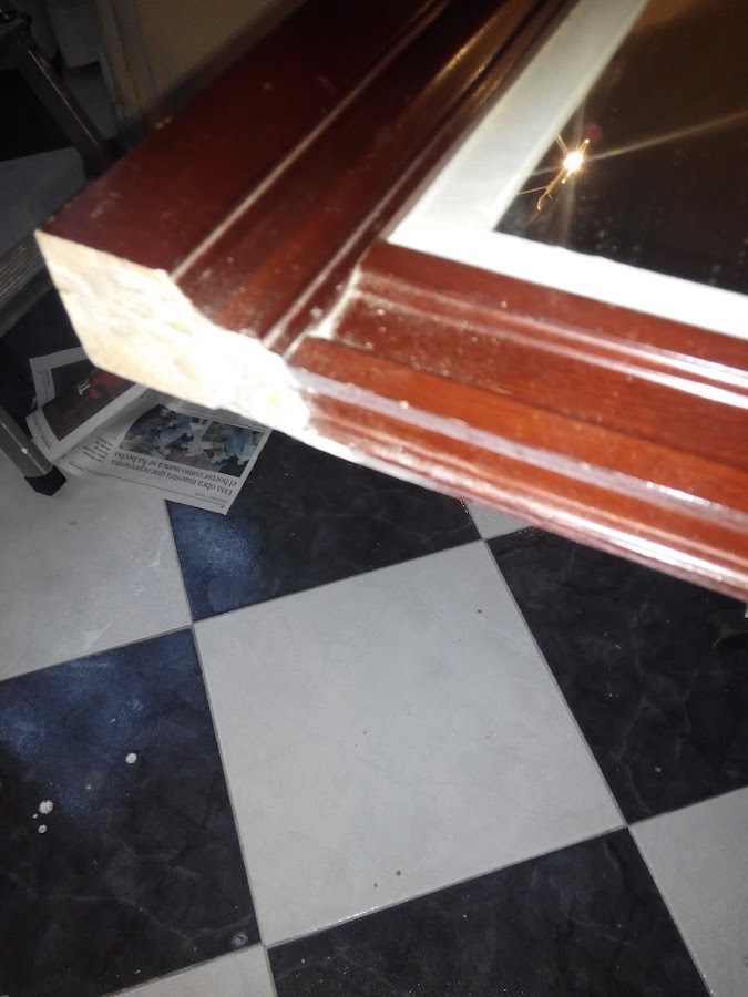 Aquí podéis ver el espejo original y apreciar el lado más ancho que había que cortar. También se aprecia el biselado del cristal tan bonito.