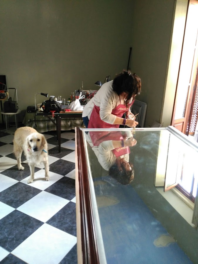 Aquí pillada "in fraganti" dando una mano de imprimación antes de pintar. Con mi inseparable compañero, mi perro Cooper, que no ha salido muy bien en la foto (porque es más guapo) en el taller que hemos improvisado en la casa antigua de mi abuela.