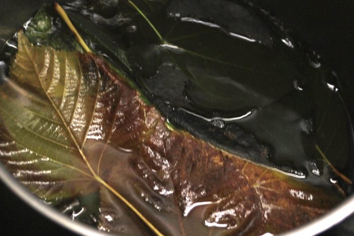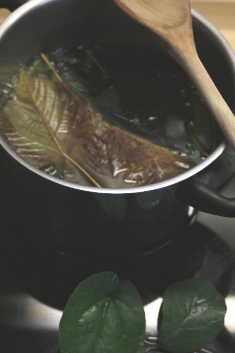 Al final, comencé a buscar y en algunas partes dicen que con "carbonato de sodio", y que el bicarbonato no funciona, pero es que a veces soy muy cabeza dura, así que me decidí a probarlo por mi misma. Tomé diferentes clases de hojas, la mayoría verdes, flexibles, con nervaduras gruesas y las metí en una olla con agua y bicarbonato de sodio, toda esta mezcla la llevé al fuego muy suave... como 2 horas y media o 3! siempre sacaba una y probaba