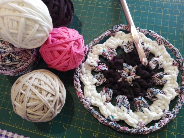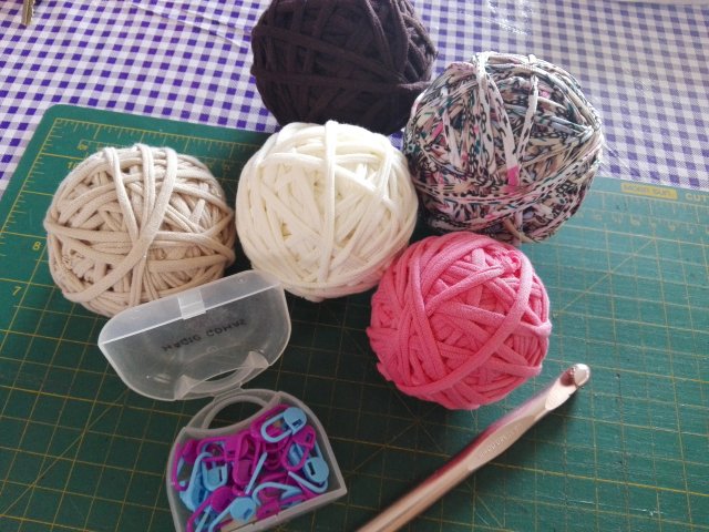 Así está mi material al principio, tiras de tela que corto y después voy uniendo para conseguir los ovillos