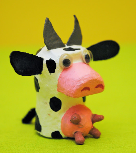Una vaca. Un tapón de corcho, de los de cava, como cuerpo. 1/3 de un tapón de vino, cortado por la mitad, para el hocico. Cartón para hacer orejas y cuernos y una bola pequeña de porexpán, cortada también por la mitad, en la que se han pinchado las cabezas de cuatro palitos de los de limpiar las orejas, para simular las ubres. Esta vaca.