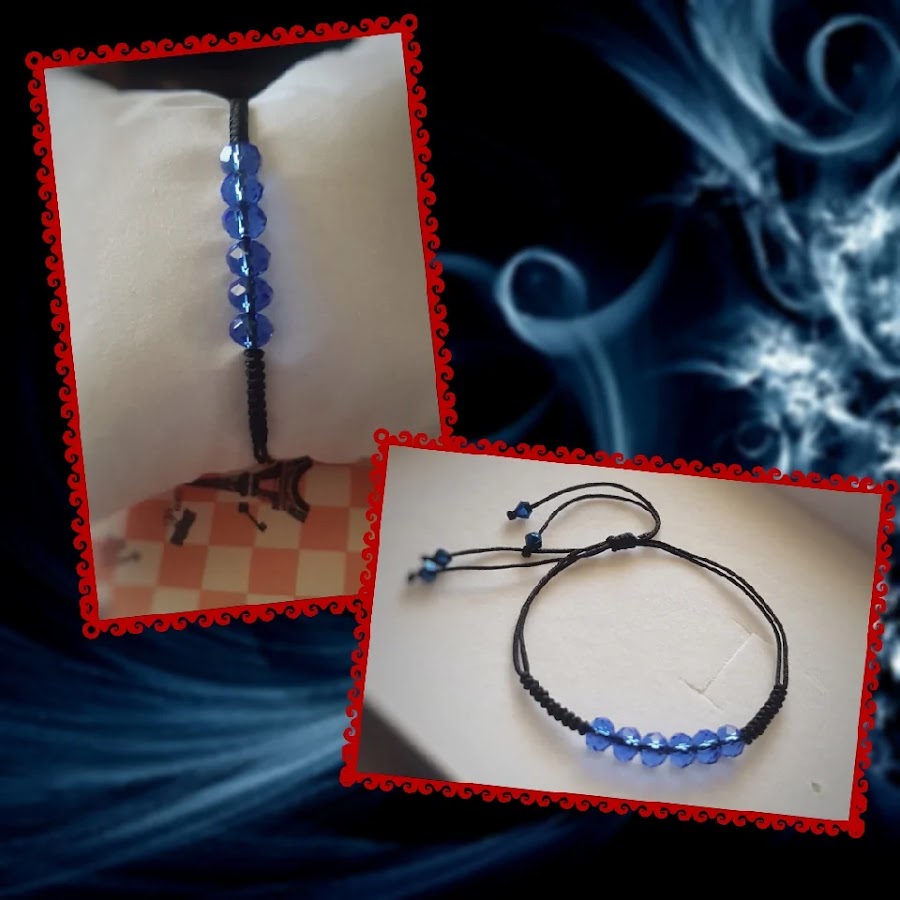 Para ello he necesitado seis cristales de Swarovski azul, dos hilos de metro y medio cada uno en color negro y cuatro tupís azules para los terminales.