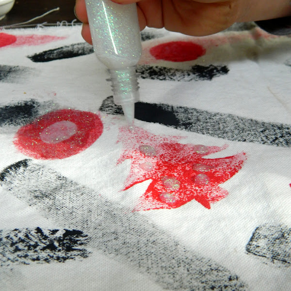 Camilo quiso participar "activamente" del proceso y con el sobrante de tela elaboró su propio estampado DIY. Claro que el pequeño, conocedor de cada objeto en sus haberes, se apersonó en el living con una esponja en forma de pino navideño que si yo hubiera visto antes...teníamos una tela de pinos nórdicos, todos muy negros y simétricos. Pero, como sabrán, mi hijo tiene genes tropicales y su pinito es rojo pasión y está lleno de brillos. Faltaba más.