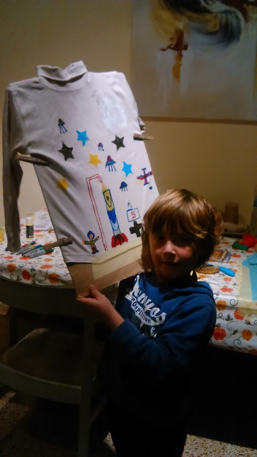 Sólo un consejo, la camiseta la ponéis sobre un cartón y con cinta de pintor, o precinto, o celo, o lo que queráis que pegue la estiráis bien para que ellos puedan trabajar sólos.