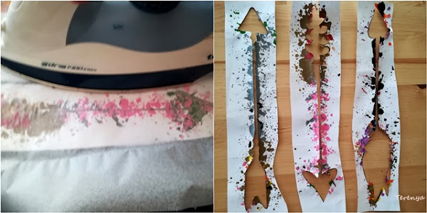 Cuando has acabado, coges papel de hornear y la plancha bien caliente. Poenes el papel por encima y pasas la plancha. Con el calor la cera se pegará al tejido. Con cuidado quitas el papel de cocina y la plantilla, y ya lo tienes estampado!