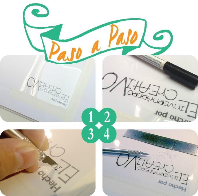En primer lugar encintamos la transparencia y el diseño a una libreta (me sirve de mártir para cortar, si tenéis una “cutting mate” mejor) y a continuación he marcado con un rotulador indeleble las zonas de las letras que no voy a cortar; esto lo hago para que los interiores de las letras se queden sujetos… Por ejemplo, si os fijáis, el “Hecho por” está escrito con una tipografía estilo “stencil” y ya incluye esos puentes.