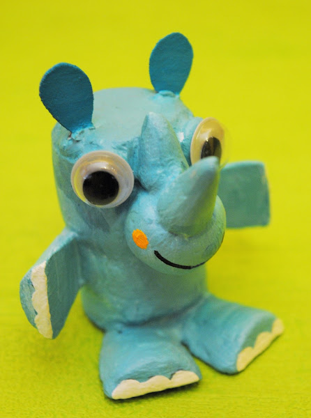 Un rinoceronte. Un tapón de cava como cuerpo. Un tapón de vino del que se han cortado 4 trozos delgados y que se han convertido en los brazos y pies. Una bola realizada con pasta de modelar de secado al aire y dos pequeños conos elaborados con la misma pasta para crear la cara y los cuernos. Cartón para las pequeñas orejas y pinturas acrílicas, esta vez de color azul celeste para darle un toque de fantasía. Este rinoceronte.