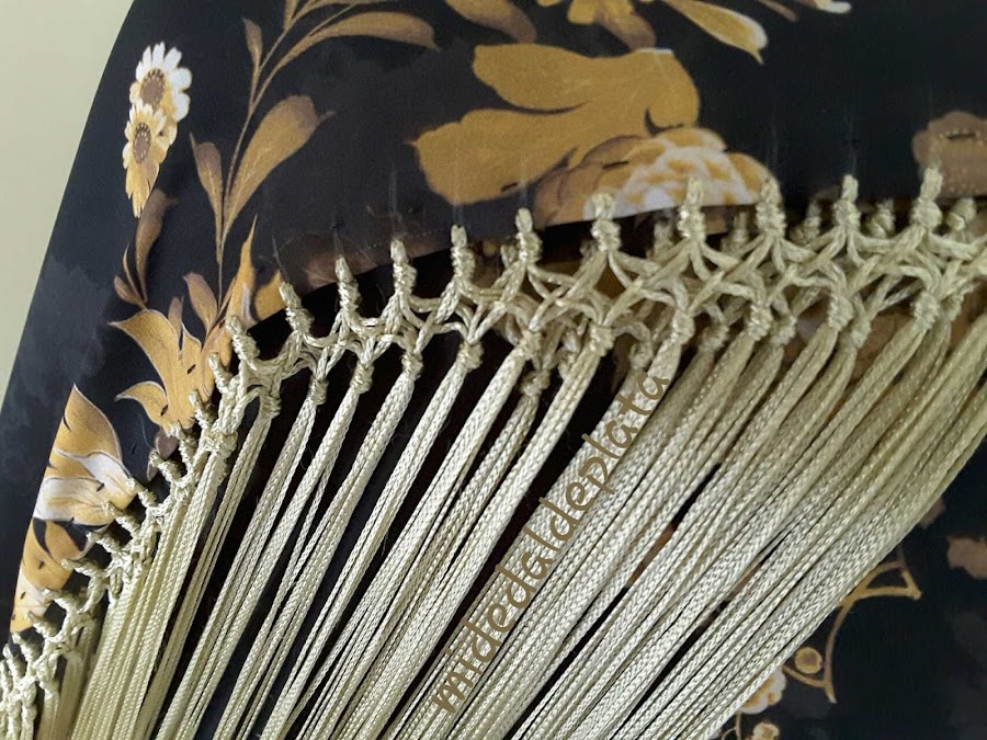 El estampado floral en tonos ocre de la estola nos hace volver a un tiempo anterior, sin dejar de ser una prenda actual y elegante. Seleccionamos el fleco en uno de esos tonos para no caer en la rutina de vestir de negro con complementos en el mismo color. La estola debe resaltar sobre el vestido o el pantalón elegidos y, sobre todo, sus flecos.