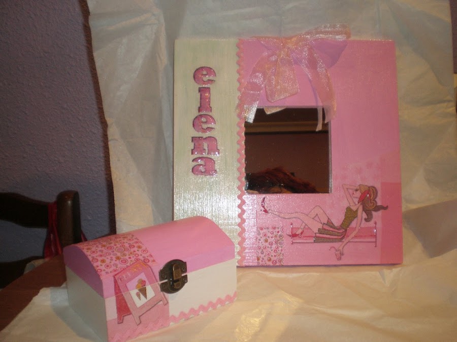 Este malma hace juego con la cajita de las monster , os aclaro , que los malmas son marcos de madera con espejo, por si le interesa a alguien , mide 26 X 26 y el espejito 10 X 10 ...
