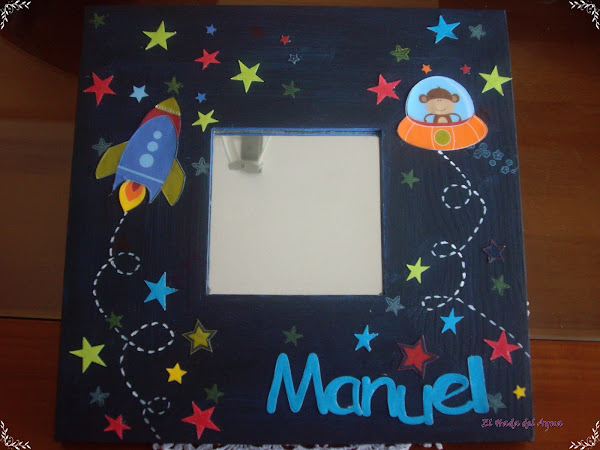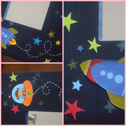 Esta elaborado de la siguiente forma, lo cubri con gesso despues de lijarlo, luego lo pinte con pintura acrilica (negra, azul y blanca), para simular el espacio sideral (ay como suena), luego recorte el cohete y la nave espacial, y algunas de las estrella de un papel de BObunny (Blast off)., y les di glossy accent para proporcionarles volumen, además utilizando la craft que estaba cogiendo polvo recorte el nombre del destinatario y otras estrellitas, y este es el resultado....