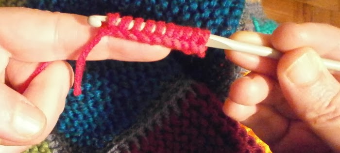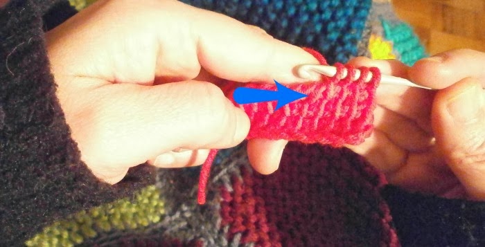 3- Cogemos hilo, y sacamos los puntos de dos en dos, hasta quedar con un sólo punto