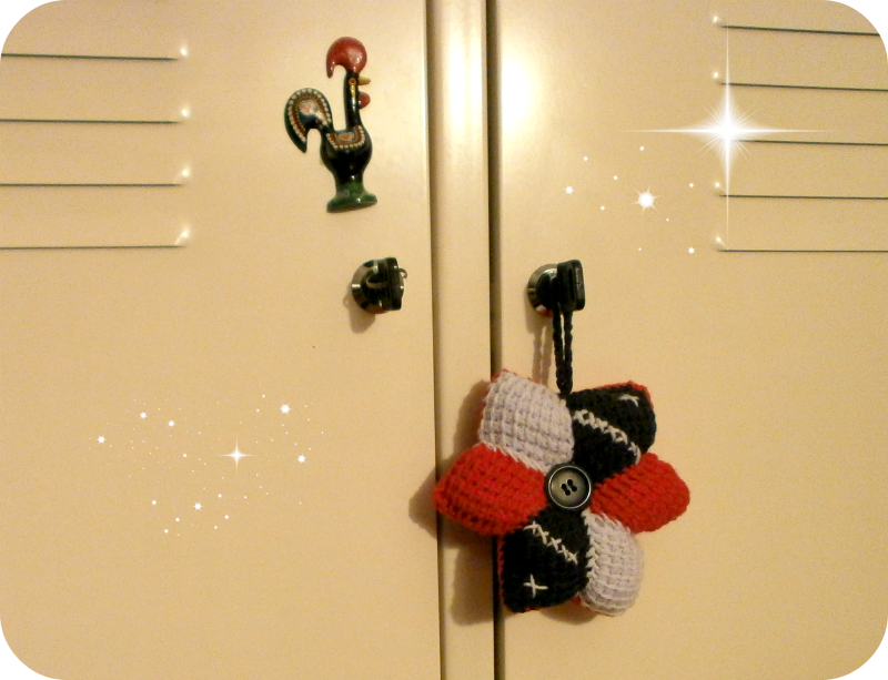 Hicimos dos partes de 6 piezas cuadradas de 10 puntos x 6 filas. Cosimos las piezas y las dos partes, rellenamos con espuma para y cosimos un botón en el medio para darle más volumen. Y como adorno, unos puntos de cruz.