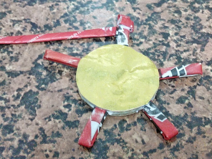 Para hacer esta estrella utilicé churritos de folletos de propaganda de color rojo, dos círculos de cartón y la tapa abre-fácil de una lata de bonito.
