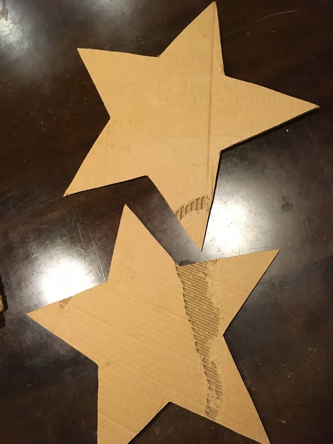 Recorta en el cartón 2 estrellas, el tamaño depende de lo tan grande que la quieras hacerla; y del mismo cartón corta 9 tiras del largo del pico de la estrella y de aproximadamente 10cm de ancho, corta una tira del mismo ancho pero unos centímetros mas corta que el resto.