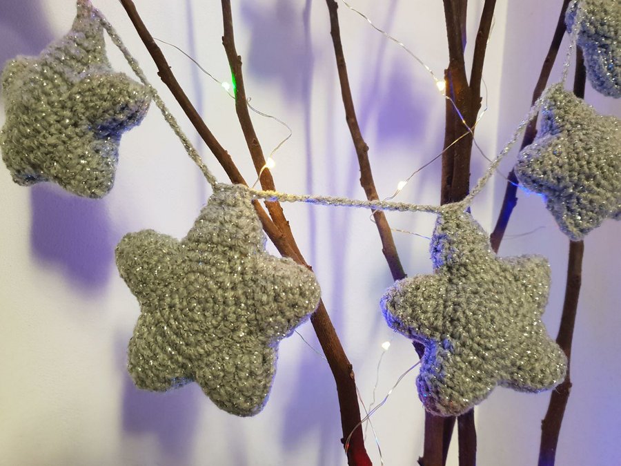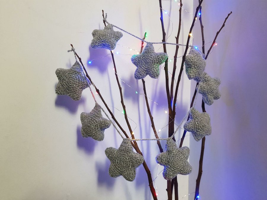 Estas estrellas se pueden poner tipo guirnalda como la que he hecho yo o sueltas para colocarlas en el árbol, os dejo el patrón.