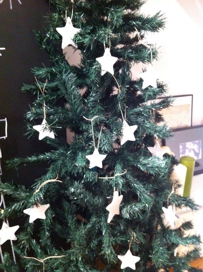 El barro blanco es muy fácil de trabajar, así que es ideal para usar con niños. Cogemos el barro y lo estiramos formando una capa. Los niños usan los moldes para hacer las estrellas. Con un palillo o lápiz hacemos el agujero para pasar la cuerda antes de que se seque.