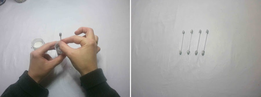 Silicona calientePues bien, esto es bien fácil. Sólo hay que introducir los bastoncitos en cola blanca, solamente por donde lleva algodón y después en brillantina. Como he dicho antes esto lo pueden hacer los niños con la vigilancia del adulto.