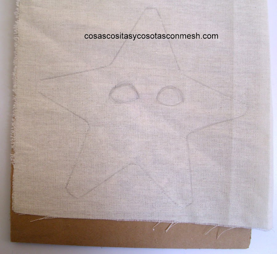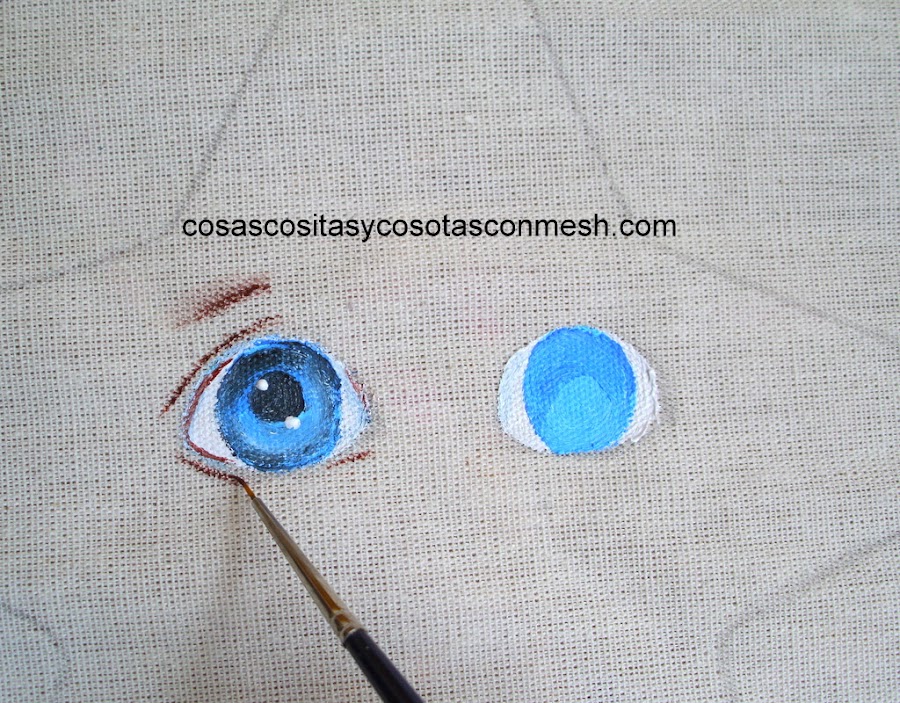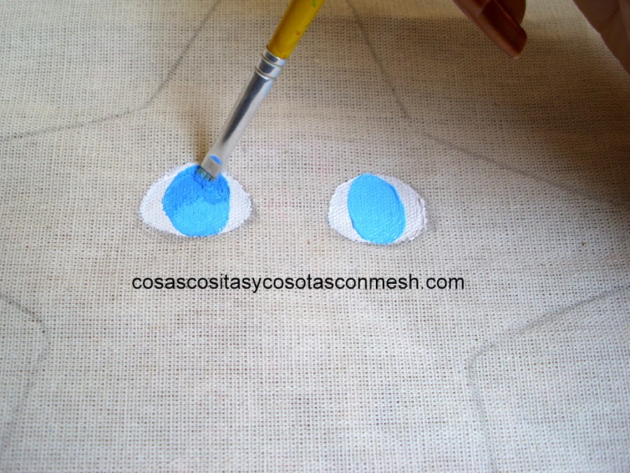 Paso2.Como no quise pegar unos ojos de plástico o de fieltro o quiza bordado,me puse a dibujar los ojos para luego pintarlos.No olvidar poner un cartón debajo de la tela antes de pintar.