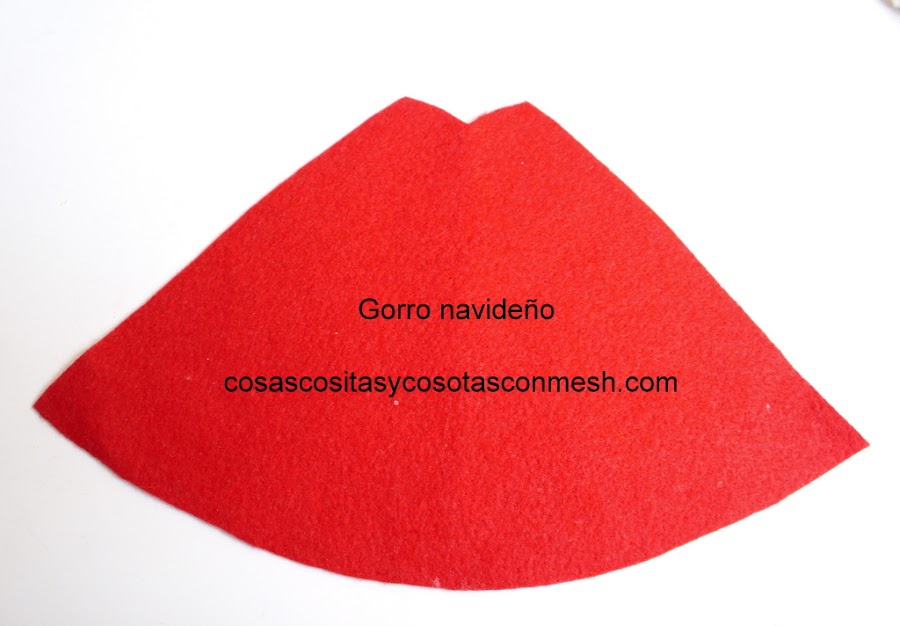 Paso 8:Hacer el gorro navideño con fieltro rojo y blanco.Yo tenia retazos de peluche y lo use para pegarlo al gorrito.Cosi unos cascabeles en la puntita del gorrito.(solo hay que doblar está pieza y coser o pegar con silicón)