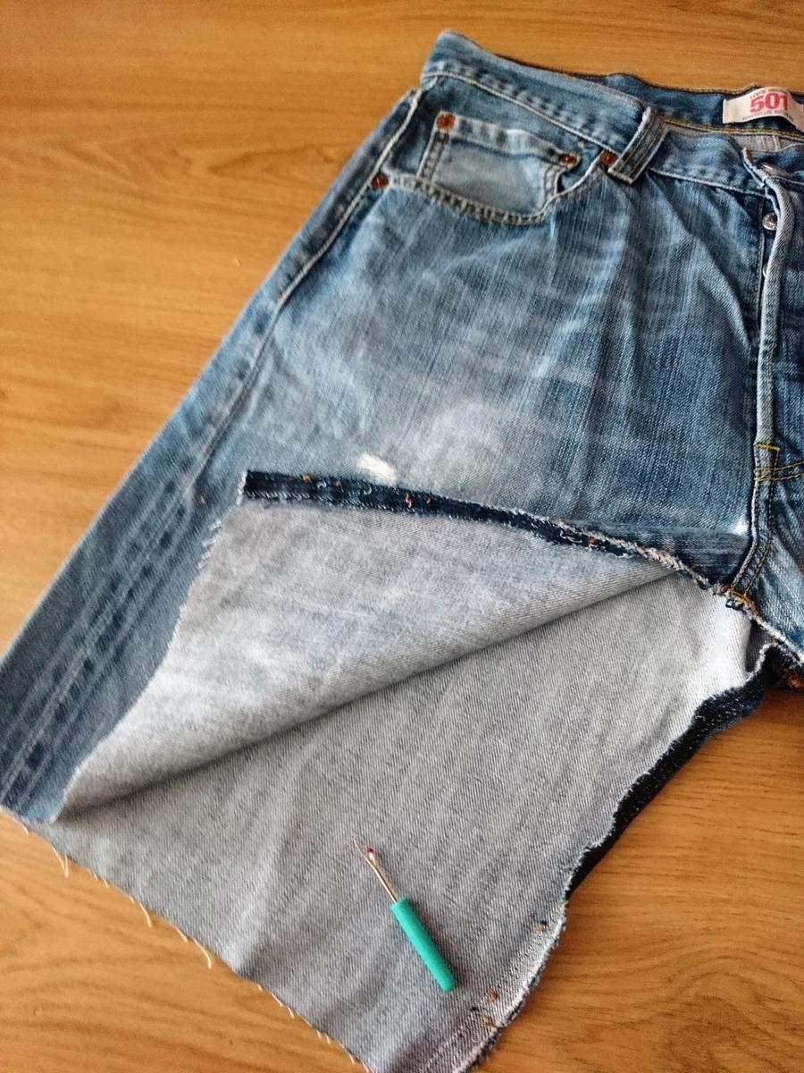 Descosemos el pantalón. Descosidas las perneras del pantalón, vamos a montar una pieza sobre otra tal y como os enseño en la foto de abajo. Nos quedará un triángulo libre de tela. Hay dos opciones: Dejarlo así o colocar un trozo de tela, que sacaremos del sobrante de tela del pantalón.