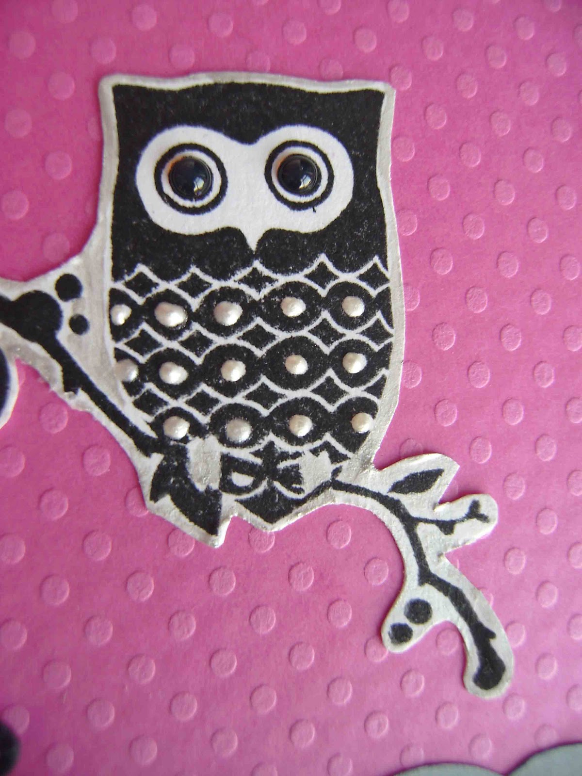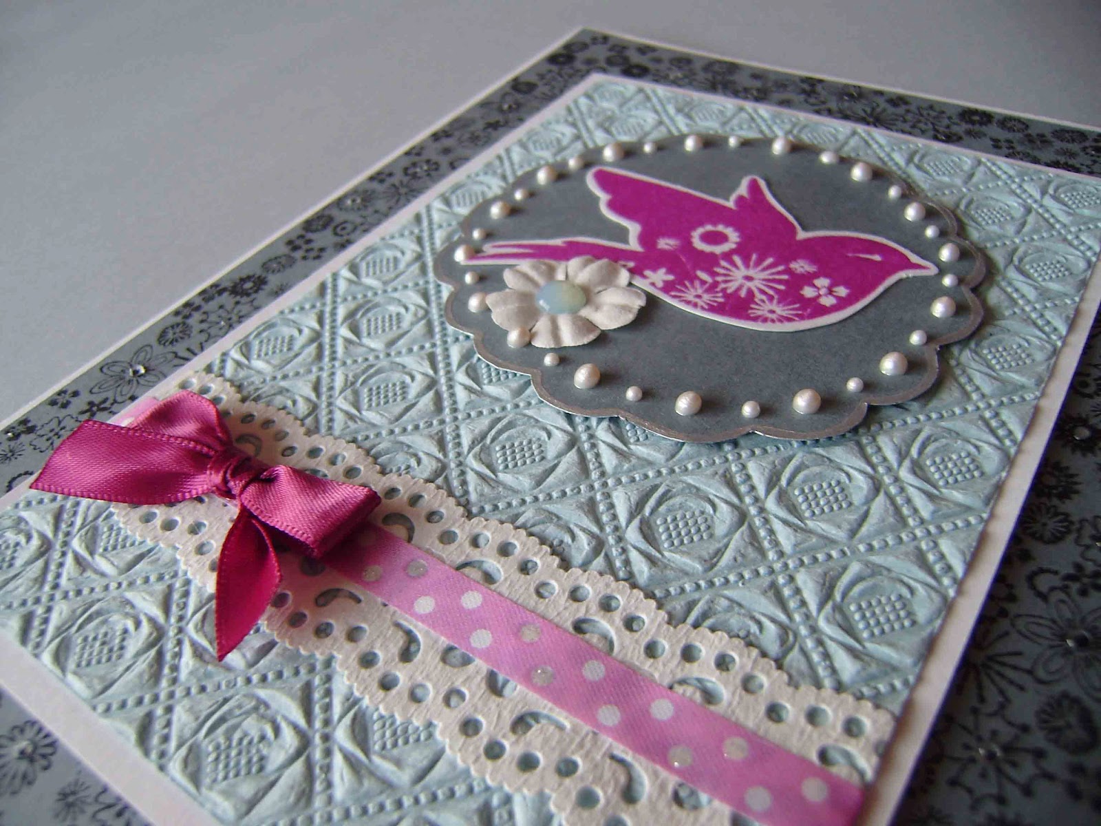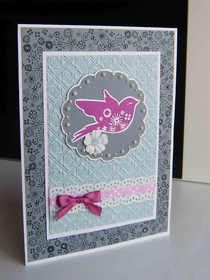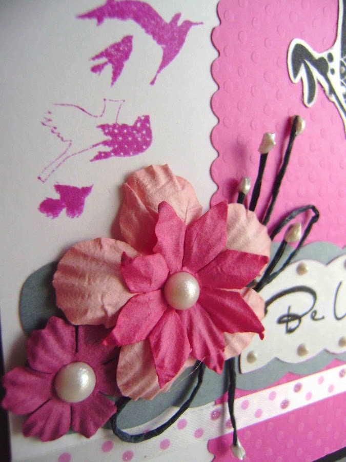En esta entarada he pensado subir más tarjetas de felicitación que había hecho hace tiempo. Empezamos por esta de tonos grises. La base es una cartulina gris, sobré la que estampé unas flores en negro y añadí unas gotas de glossy accent en algunas. El pájarito también es un sello de la misma colección que las flores.