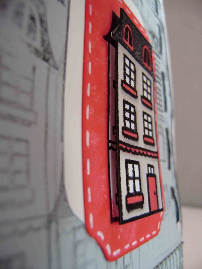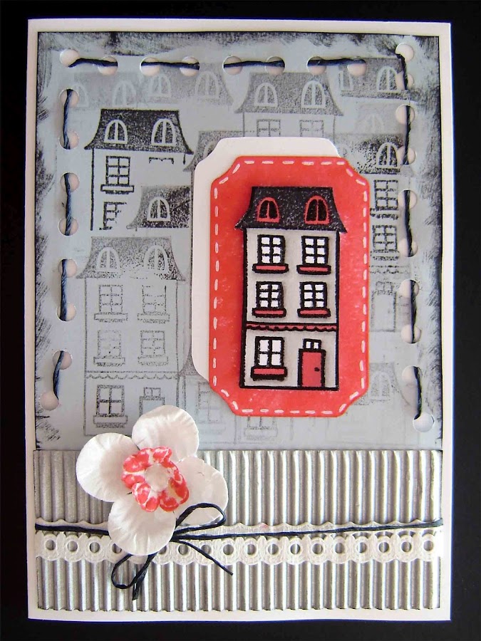 La siguiente tarjeta me ha sorprendido con su aspecto final. Cuando empezé a hacerla, no sabía realmente lo qué quería, solo deseaba emplear mis nuevos sellos de los cuales escogí esta casita :)) Ya veis que soy una mañatica de los sellos!!! Y bueno, experimentando y probando, se iba creando esta imajen. Con un toque ingles, no? El texto tampoco lo pùse dejando para una ocasión especial, que podría ser "Bienvenido a casa!" o "Enhorabuena!"...
