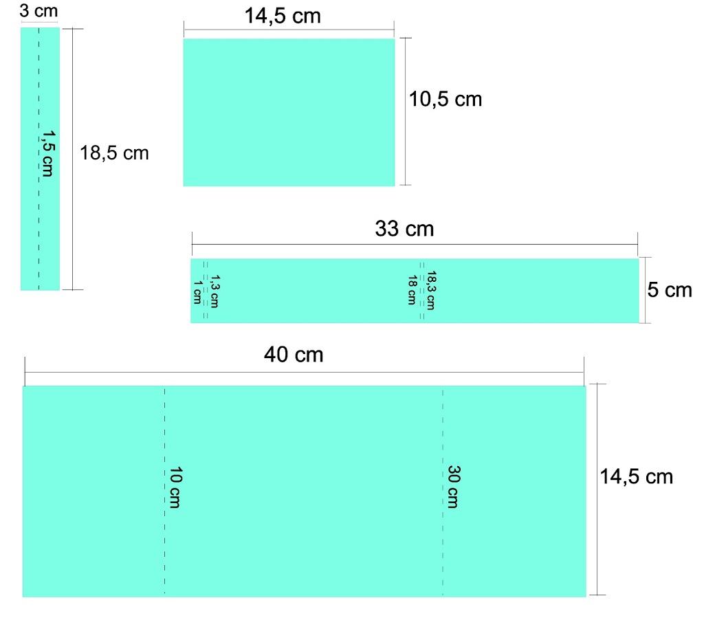 Las piezas que tenemos que cortar para esta estructura son las siguientes (para fotos de 10×15 cm), la composición resultante una vez pegadas y montadas todas las piezas medirá 22×16,5 cm por lo que si la página de tu álbum mide menos de 22 cm, esta estructura con esta medida no serviría para el proyecto.