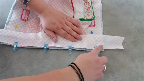 Ahora justo encima de ésta pieza y por el lado de la guata, colocamos la pieza de los estuches y y las unimos con el bies o como es mi caso, la tira de tela a modo de bies, de ésta manera: