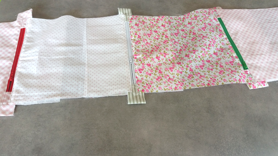 Hecho esto, cosemos las cremalleras empezando a ponerlas por unas de las piezas de 22x23cm con su respectiva pieza de forro; seguida de las dos piezas de 25x25 cm y terminando con otra de 22x23 cm, cada una de ellas con sus forros.