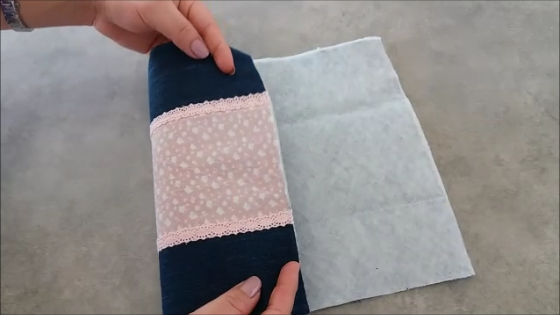 Simplemente decoramos a nuestro gusto la pieza de 23x36, yo en mi caso le he puesto un cuadrante central con encaje de algodón a los lados. Luego de ésto he pegado la pieza a la guata usando la plancha bien caliente y sin vapor.