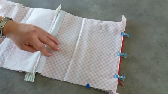 Ahora vamos a preparar los laterales empezando por juntar derecho con derecho de las piezas y cosemos a 1 cm del borde, dejando la parte más ancha abierta.