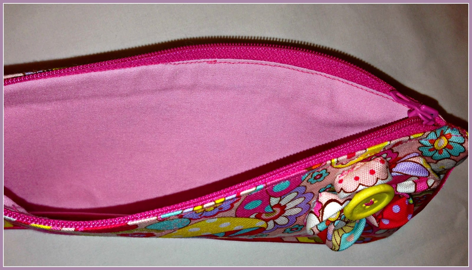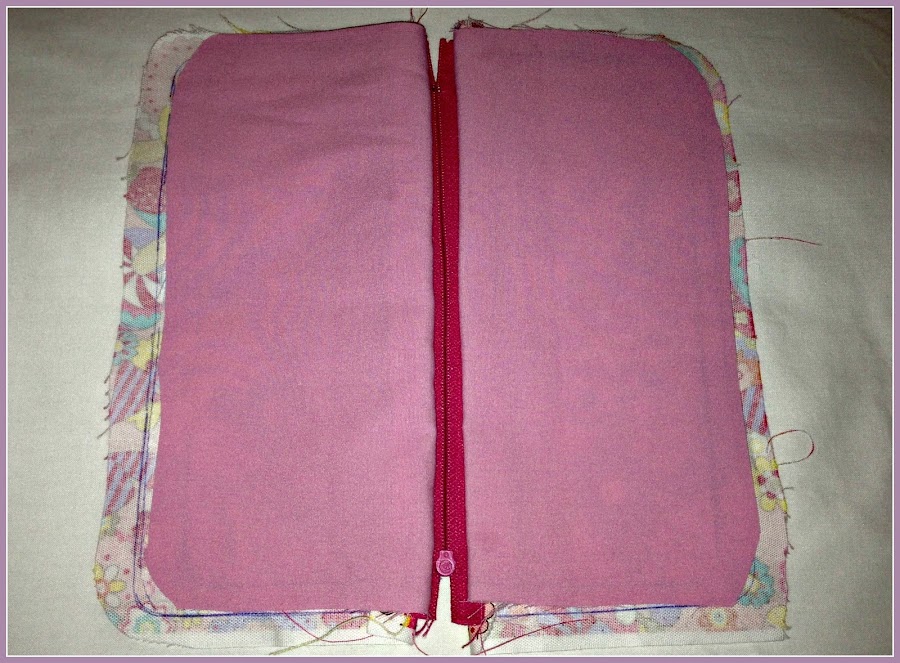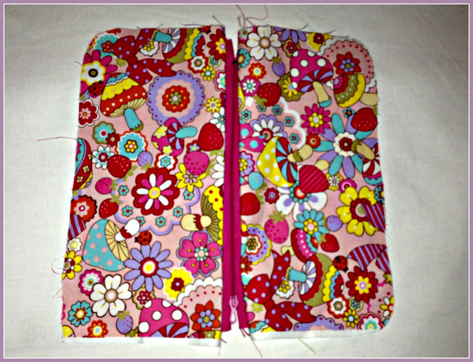 El resto lo hacemos como en el tutorial que os he indicado, cosiendo por un lado las dos telas exteriores enfrentadas por el lado derecho, y por el otra lado las dos telas interiores, sin terminar de coserlas (dejamos un agujero en el centro de la tela interior) para poder dar la vuelta al estuche. Es importante hacer esto con la cremallera abierta. Una vez hecho esto, damos la vuelta al estuche y ponemos el forro en su sitio, cerrando la abertura que habíamos dejado.
