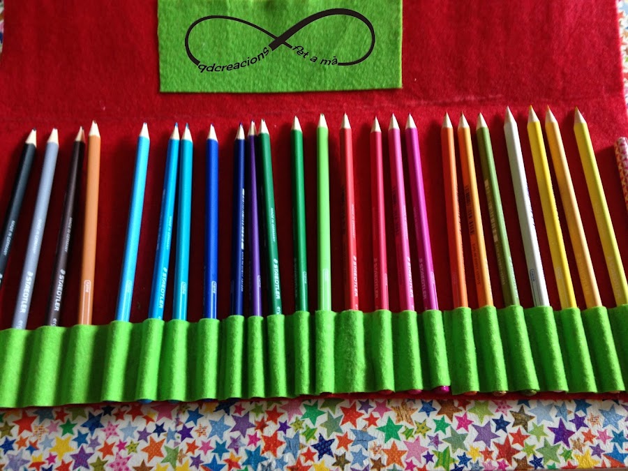 El material que utilicé es fieltro. Yo tenia un trozo cuadrado por casa de ese color, y otro más estrecho de color verde, que además le iba genial y con el modelo del lápiz, lo que hacia era ir dando puntos de calor con la silicona caliente y enseguida el fieltro se pegaba.