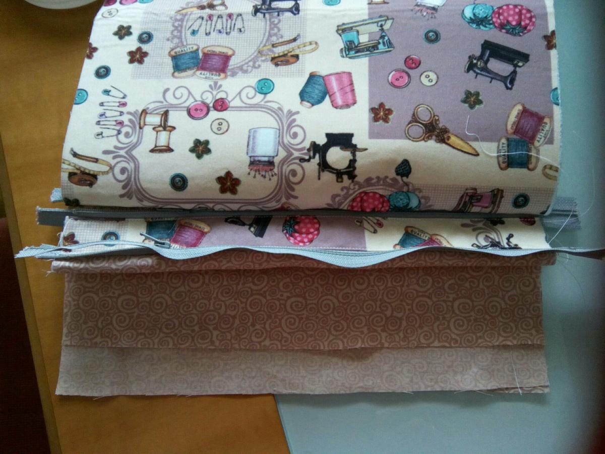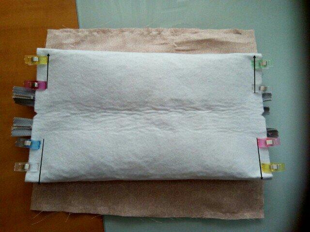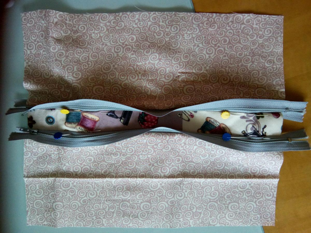 Cosemos las dos cremalleras, una a cada lado de la tela exterior pequeña y por el revés de cada cremallera ponemos una de las piezas de forro.