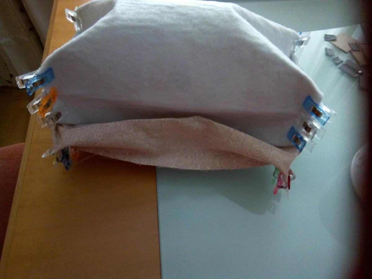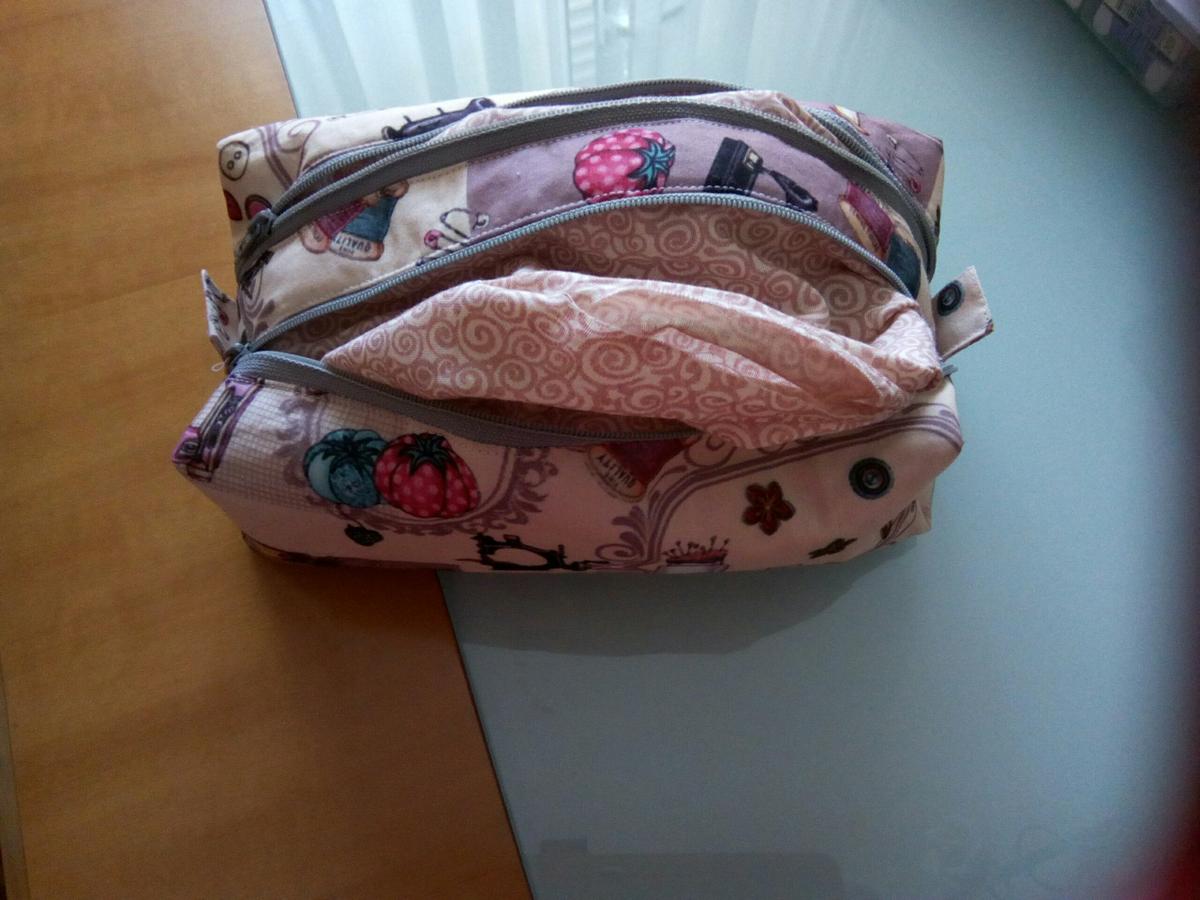 Volvemos del revés y cerramos los dos bolsillos uniendo las telas de forro derecho contra derecho, dejando un hueco sin coser en la base de uno de los dos para poder darle luego la vuelta al estuche.