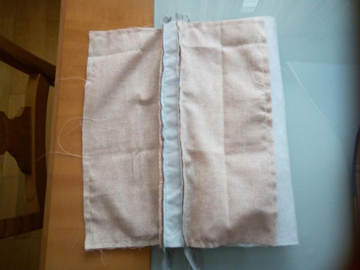 Ahora hacemos lo mismo con el otro lado de la tela principal doblándola hacia el derecho de la otra cremallera y por el revés pondremos la otra tela de forro. Volvemos del derecho y hacemos una costura de asentamiento.