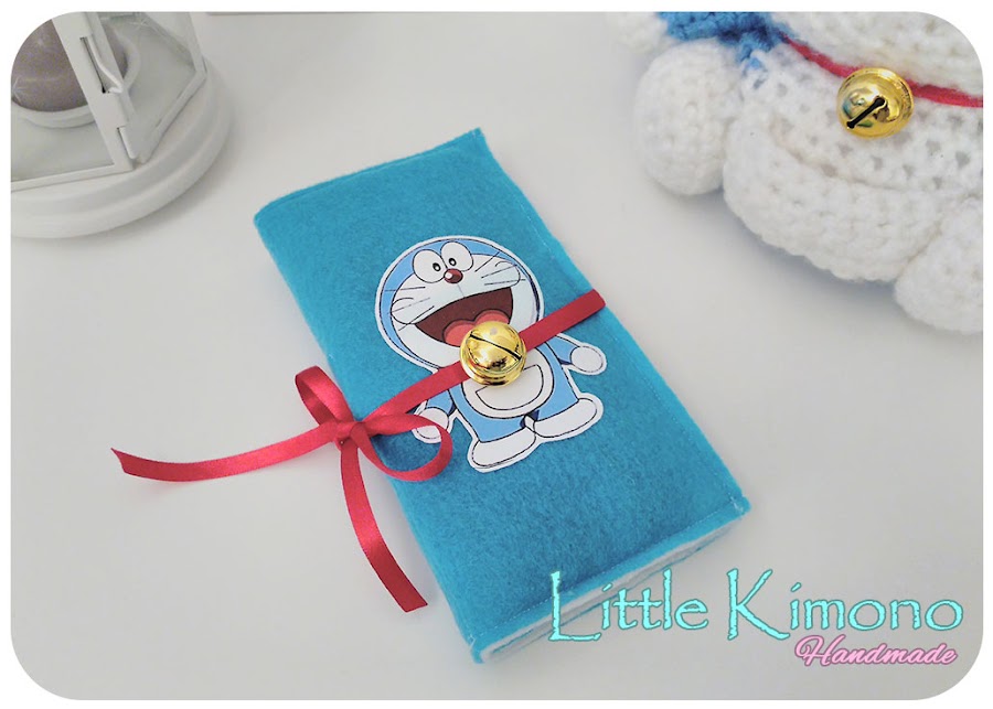 Finalmente colocamos el cascabel en la cinta de raso y ya tenemos nuestro estuche enrollable para usar! Como veis he calculado para que la cinta y el cascabel queden justo en el collar de Doraemon ◠‿◠