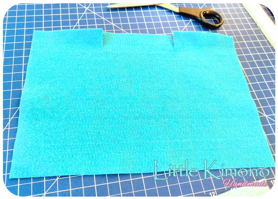 Primero recortamos un rectángulo en el fieltro azul de unos 30x20cm y hacemos dos cotes, uno a los10cm y otro a los 20cm.